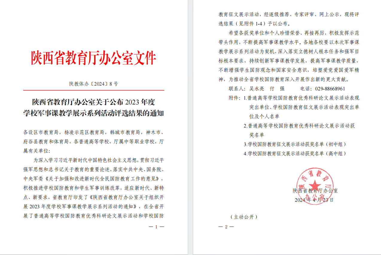 近日,陕西省教育厅办公室公布了《关于2023年度学校军事课教学展示系列活动评选结果的通知》,多多28学生服务中心军事理论教研室副主任王宏社副教授的论文《提质普通高等学校国防教育应抓好“四全”》荣获普通高等学校国防教育优秀科研论文三等奖,实现了学校自军事理论教研室组建并参赛以来获奖零的突破。