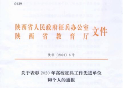 近日,陕西省人民政府征兵办公室通报表彰2020年度高校征兵工作先进单位和先进个人。我校因征兵工作成绩突出,荣获2020年度高校“征兵工作先进单位”荣誉称号,我校党委学生工作部(征兵工作站)黄珂同志因成绩突出,被西安市雁塔区国防动员委员会评为“2020年度民兵整组工作征兵工作先进个人”。我校荣获2020年度高校“征兵工作先进单位”荣誉称号我校党委学生工作部(征兵工作站)黄珂同志被西安市雁塔区国防动员委员会评为“2...