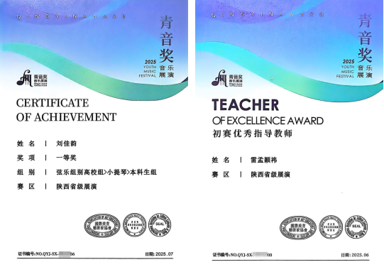 近日,由国际美育艺术家协会与“青音奖”音乐展演全国总展演组委会举办的2025“青音奖”音乐展演,及由香港中外文化艺术交流协会、陕西秦筝苑与西安市秦筝协会举办的第十六届国际古筝比赛在西安举办。多多28艺术教育中心教师雷孟颖祎带领大学生艺术团成员刘佳韵、康有庆组队参赛,最终荣获小提琴高校组一等奖和古筝高校组银奖的优异成绩。雷孟颖祎老师也因出色的指导工作,被授予“优秀指导教师”称号。此次优异成绩的取...